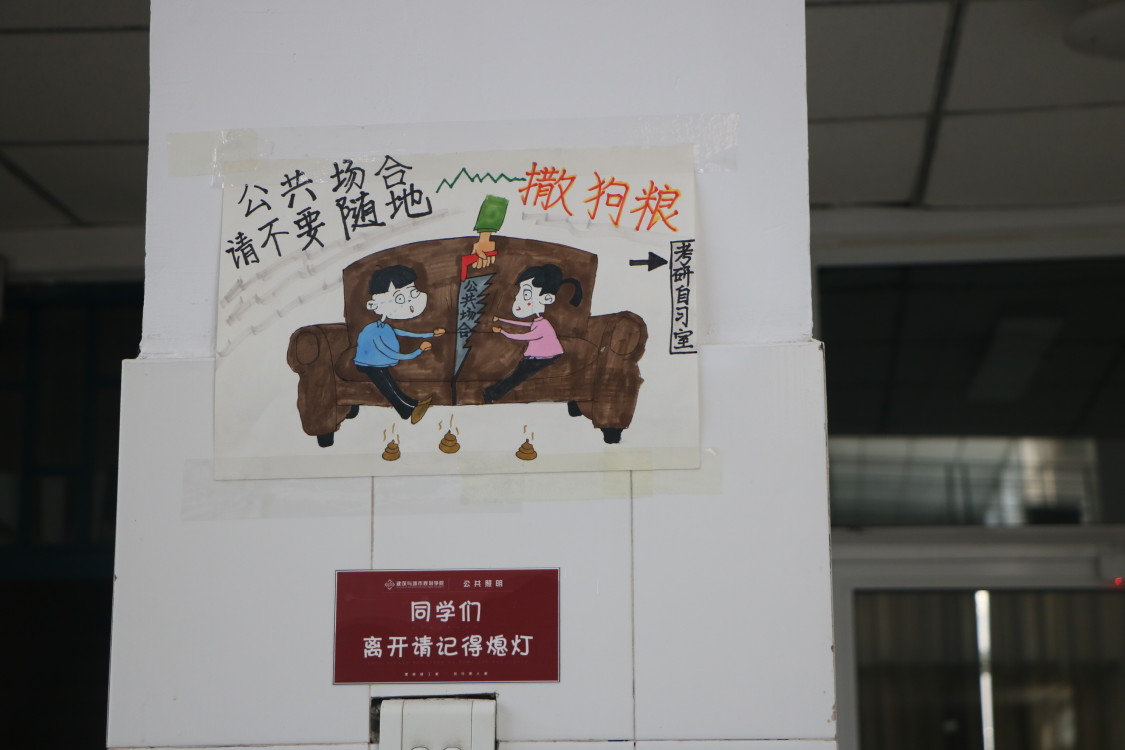 首先,此次活动于建筑与城市规划学院大厅开始。由青年志愿者协会的部长分发给协会成员优秀的绘画作品。然后,协会成员分多路在教学楼多处粘贴优秀的绘画作品宣讲文明,一幅幅简单明了的作品无不在提醒着我们要讲文明树新风,在公共场合注意自己的言行举止。