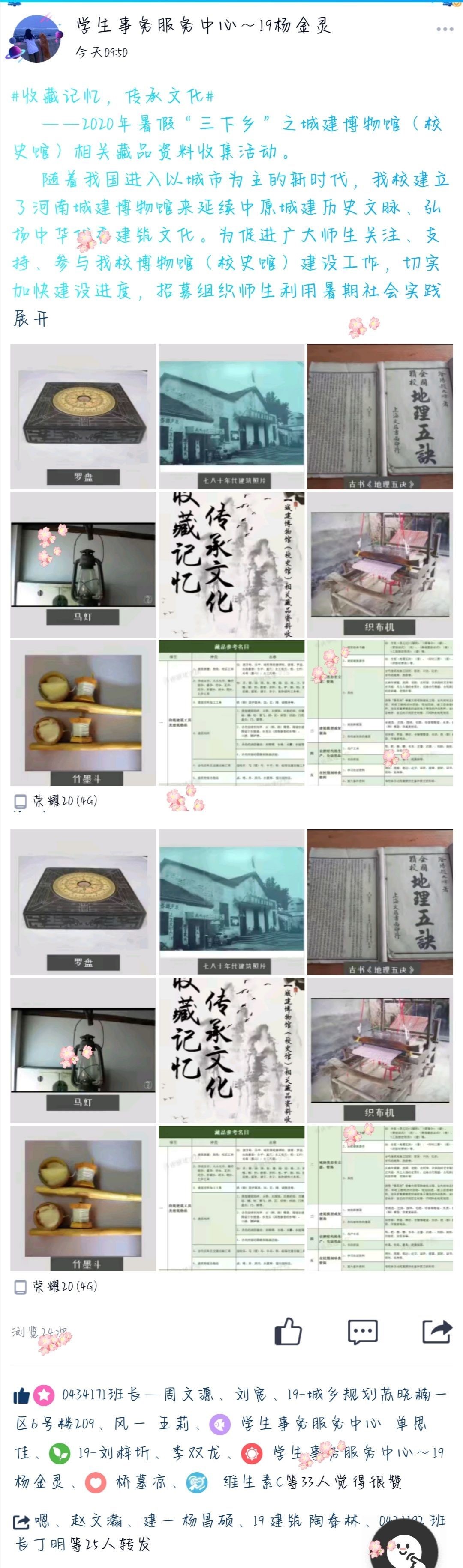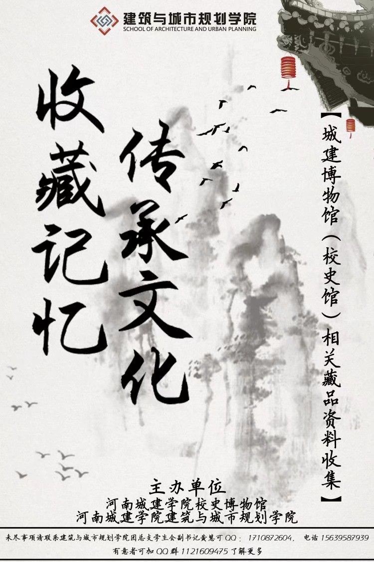(通讯员:袁航哲)随着“收藏记忆,传承文化”活动的正式展开,为更好地促进广大师生关注、支持和参与河南城建学院博物馆(校史馆)建设工作,建筑与城市规划学院2020年暑假“三下乡”之城建博物馆相关藏品资料收集活动的宣传工作于2020年7月19日正式拉开帷幕。