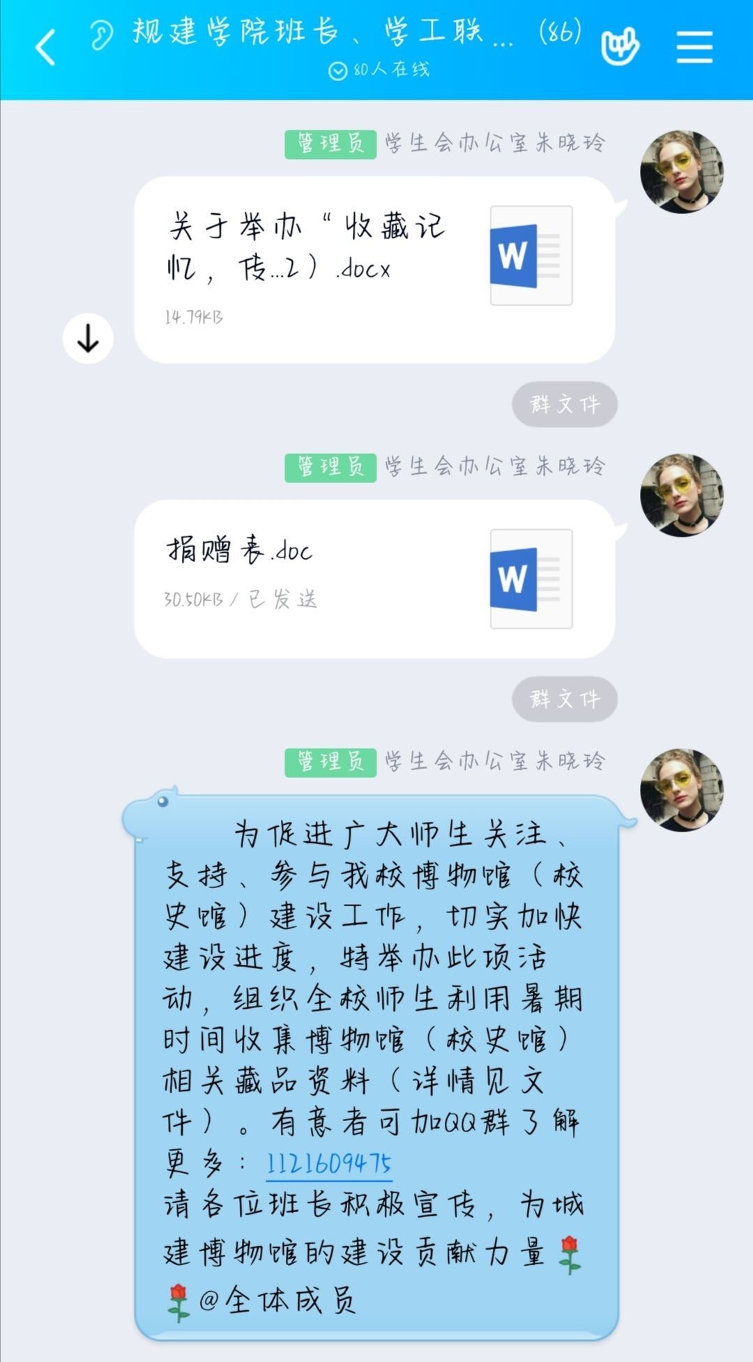 团队成员们进行了多方面的活动宣传,在学院班委群内发布通知,让各班班长在班级内进行宣传,使更多的同学了解到本次活动。团队成员还发布了说说,详细介绍活动的意义,并列出藏品收集参考名目。之后团队成员集体转发说说,扩大宣传的范围。