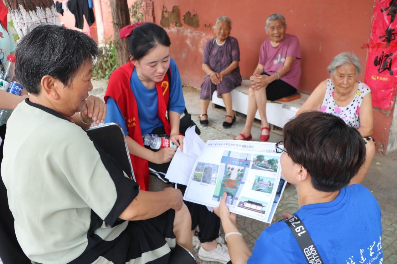 上午9点,实践团成员向大李庄村出发,到达大李庄村后,他们向坐在树下乘凉的村民介绍最终的设计方案。首先,他们向老人介绍了广场内座椅的安排,老人聆听后对此感到很满意,并握着实践团成员的双手表示感激,口中说道:“现在能真正为老人考虑的人不多了,真的谢谢你们”。紧接着,他们再次前往“奶奶庙”附近进行实地勘察,确保设计方案与场地能够完美结合,随后,他们来到了一户村民的家中,与村民聊起了家常,最后,实践团成员与村中的一位小学校长就最后的设计方案进行了讨论,校长再三叮嘱一定要为老人装上座椅,确保村中儿童的安全,另外在后期建设广场时要最大限度的保留“奶奶庙”的原样,使“奶奶庙”不因施工的原因遭到破坏。