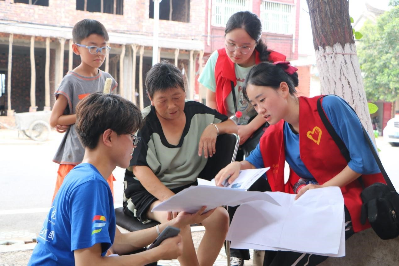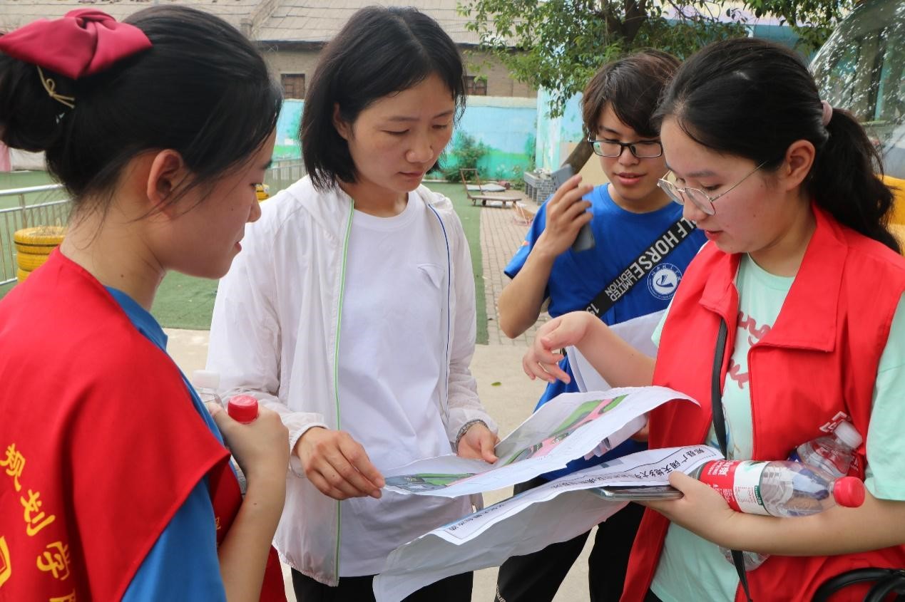 图为实践团成员和村中的小学校长共同商讨最终的方案
