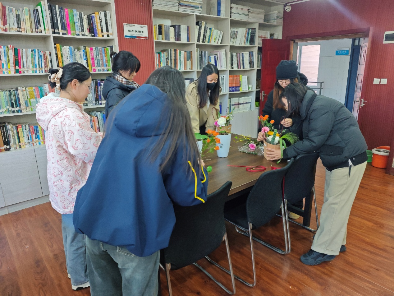 活动现场暖意融融,鲜艳的玫瑰、雅致的桔梗、清新的尤加利等花材整齐摆放,专业花艺老师先为同学们讲解了花材识别、色彩搭配、修剪技巧及造型设计等基础知识,随后手把手指导大家进行插花创作。同学们热情高涨,专注地挑选花材、修剪枝叶、构思布局,在指尖的灵动操作中,原本零散的花材逐渐变成一个个错落有致、创意十足的花艺作品。创作过程中,大家相互交流心得、分享技巧,教室里满是欢声笑语,鲜花的芬芳与彼此的关怀交织成冬日里最温暖的画面。
