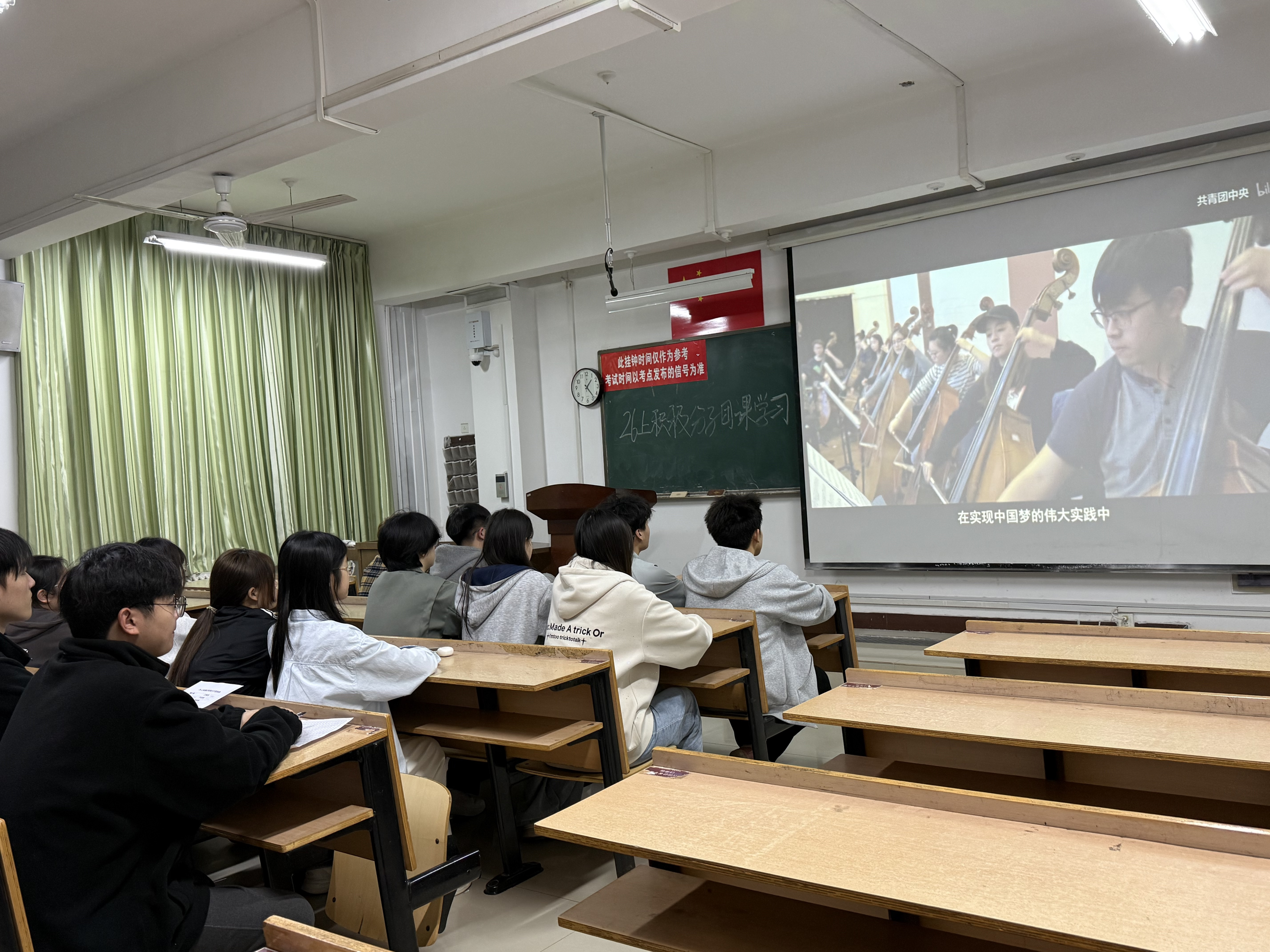 本次团课以集中观看学习视频的形式开展。活动现场,全体入团积极分子有序就座,在教室内集中观看共青团主题教育视频。视频内容围绕共青团的历史使命、青年责任与理想信念教育展开,画面中呈现了共青团旗帜、青年榜样事迹等内容。参与学习的同学们全程保持专注,认真观看视频内容,部分同学边看边记录要点,课堂秩序井然。通过直观的影像资料,同学们系统学习了团的相关理论知识,深化了对共青团组织的认识,完成了本次团课的集中学习环节。