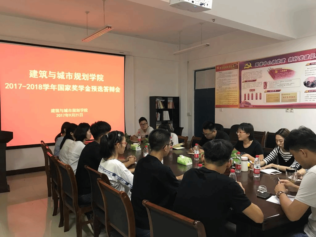 (通讯员:袁航哲)按照学校要求,为切实做好国家奖学金的评审工作,激励勤奋学习、积极上进、德智体美全面发展的学生,体现国家和学校对广大学生的关怀。9月21日下午两点半,建筑与城市规划学院2017-2018学年度国家奖学金评审答辩会在4号教学楼B306会议室举行。学院党总支副书记周勃,学工办主任、团总支书记刘花培、全体辅导员和7名国家奖学金候选人参加了会议。