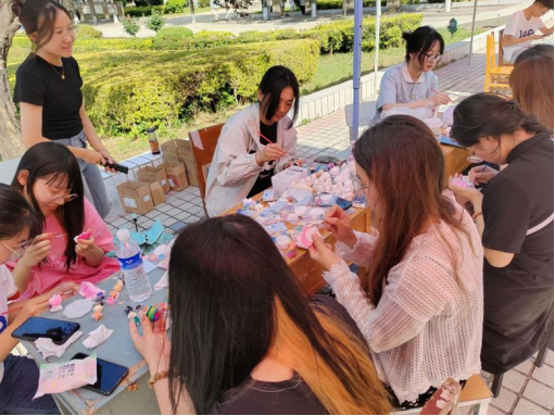 活动伊始,本次活动组织者向大家展示了不同大小的石膏娃娃底模供大家选择,同学们热情高涨,纷纷挑选自己喜欢的石膏娃娃进行绘制。在创作过程中,同学们仔细的用画笔细细勾勒出娃娃的五官,涂抹颜料,将每个石膏娃娃展现的栩栩如生,喷泉广场周围充满了快乐、轻松和愉悦的氛围。随着时间的流逝,大家逐渐完成了自己的创作,并一起展示分享了自己的灵感来源和设计思路。此次活动在大家互相欣赏和拍摄作品的过程中圆满落下帷幕。