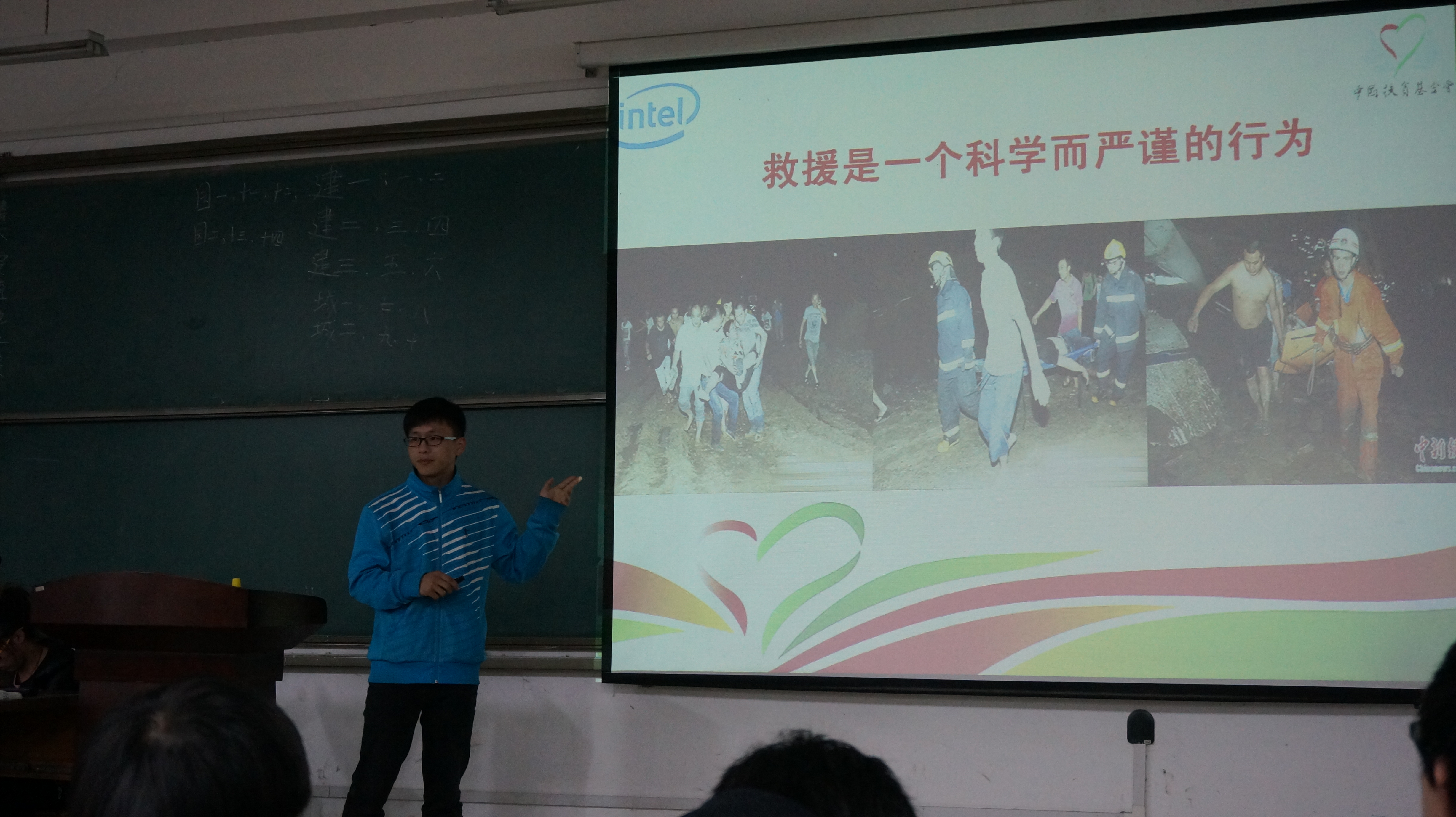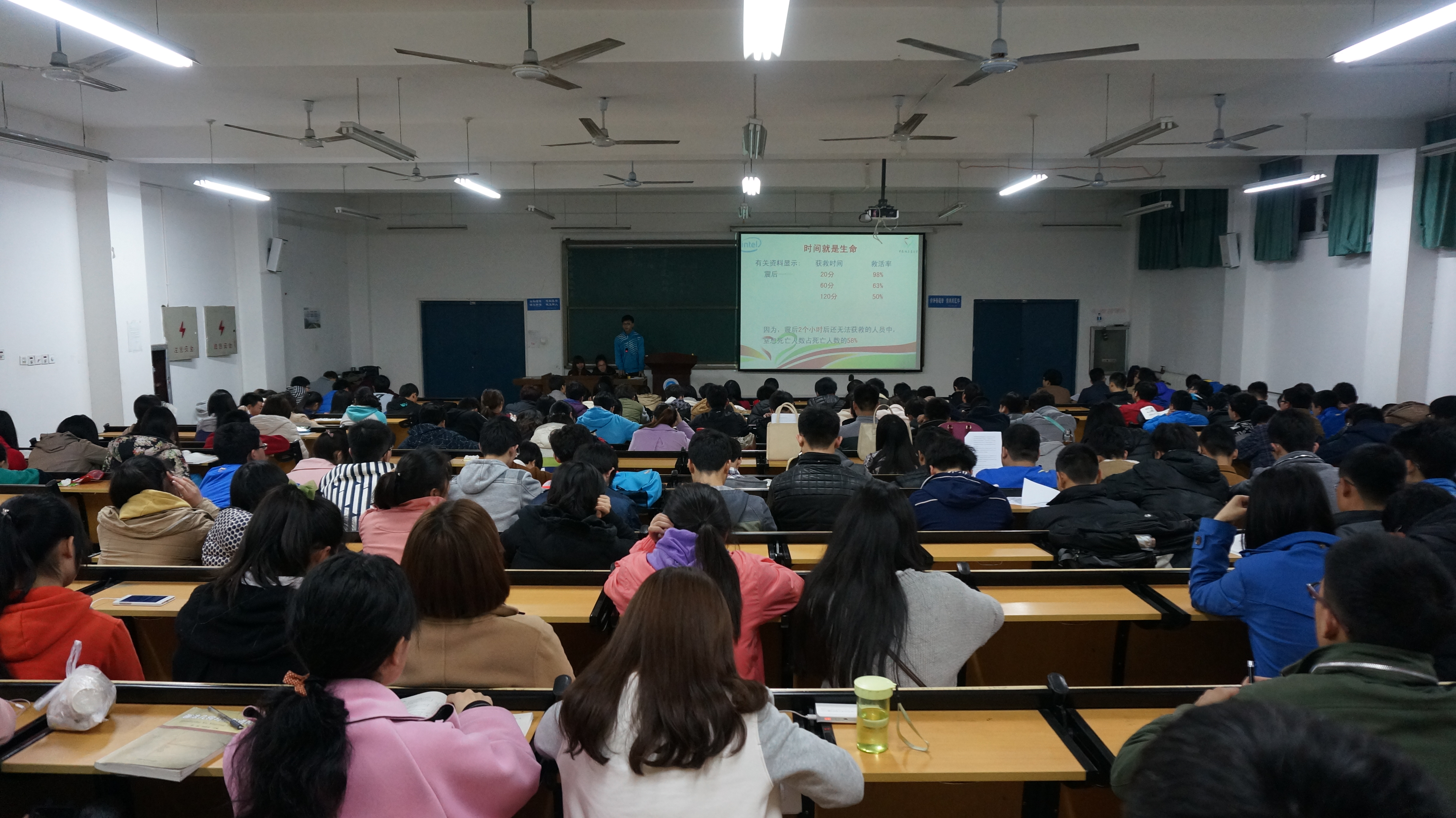 本次讲座由三部分构成,分别是防减灾的重要性,踩踏事件如何自救以及每个人都应该掌握的消防知识…在第一节防减灾的重要性中,通过一个地震现场视频向规建大一新生展示了灾难现场的残酷,以及几组照片,让他们明白缺乏急救知识可能造成的危害,几个问题更是让同学们深思,让同学们了解基层应急力量的八大优势,分别是:1.准确的指引专业救援力量快速准确的到达现场2.第一时间识别、上报、阻止谣言的传播3.安全有效的配合专业救援队的工作4.维护灾害现场治安秩序5.保障物资运输通道的畅通、清理外围环境6.护理和搬运伤员,分配救援物7.有效的补充专业救援人员数量的不足8.安抚当事人家属。